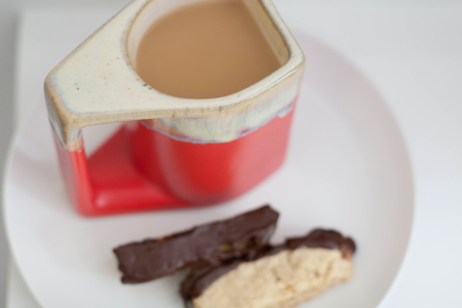 Dipped in dark chocolate and then dipped in hot coffee. YES!